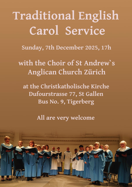 On Sunday 7th December 2025, starting 17.00, a traditional Carol Service with the choir of St. Andrew’s Church, Zurich will be held for the 45rd time at the Christkatholischen Kirche in St. Gallen.